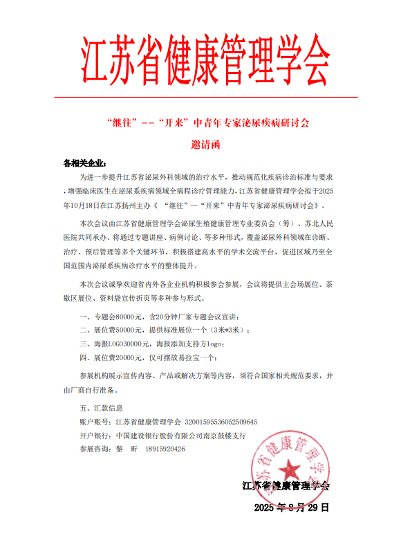 为进一步提升江苏省泌尿外科领域的治疗水平,推动规范化疾病诊治标准与要求,增强临床医生在泌尿系疾病领域全病程诊疗管理能力,江苏省健康管理学会拟于2025年10月18日在江苏扬州主办《 “继往”--“开来”中青年专家泌尿疾病研讨会》。