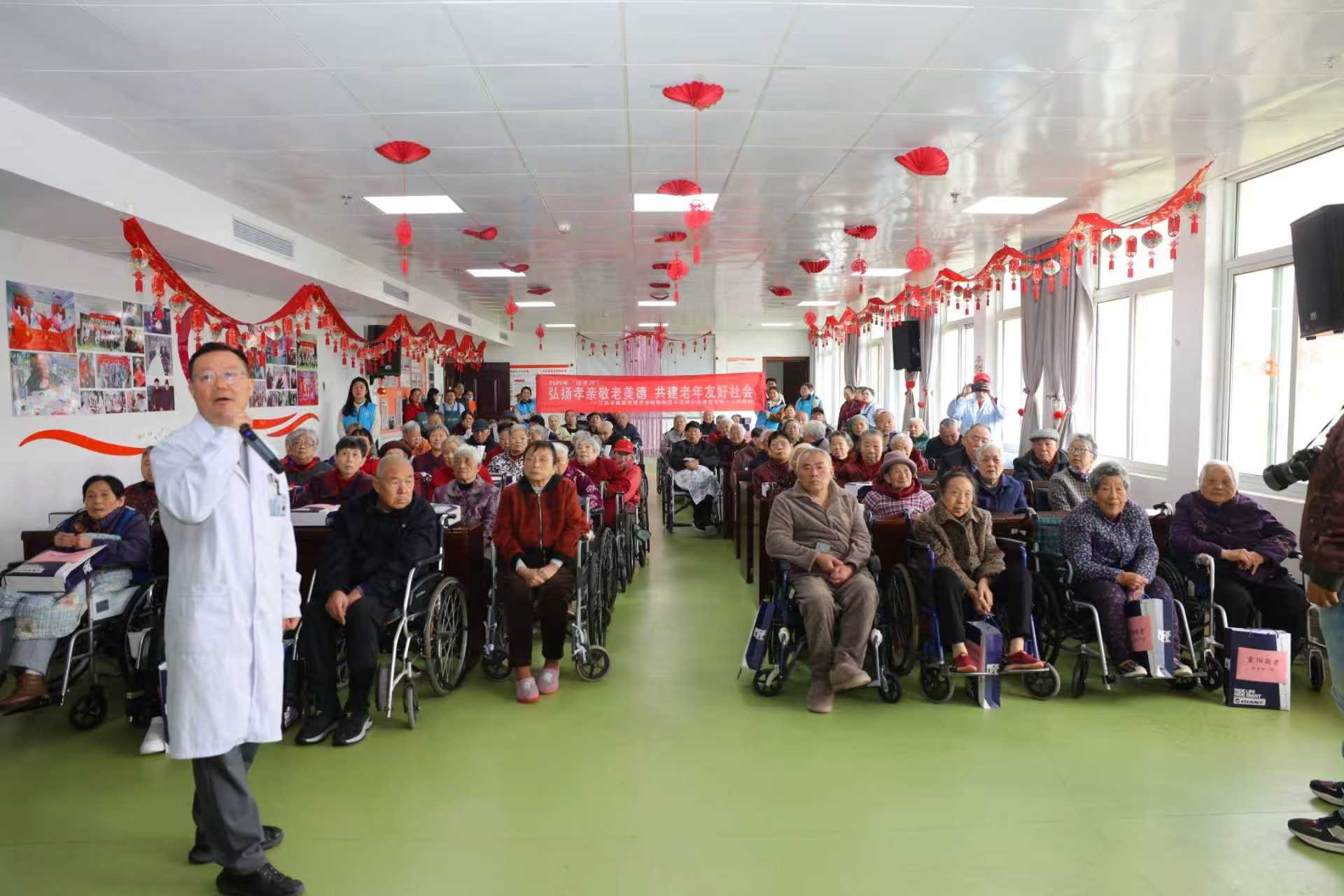 老年医学科主任汪为民用通俗易懂的语言为老人们讲解了骨质疏松、高血压、糖尿病防治相关健康知识,指导老人们合理膳食和居家锻炼方式。健康讲座后,赵松青带着志愿者们和老人们一起分享一个写有“九九重阳,爱心敬老”的大蛋糕,现场气氛非常温馨。医护志愿者还走进养护中心的房间,为行动不便、卧床的老人进行心肺听诊、检测血糖、血压。针对检查中发现的问题给予个性化的健康建议和用药指导,让老人们足不出户就享受到了专业的医疗服务。